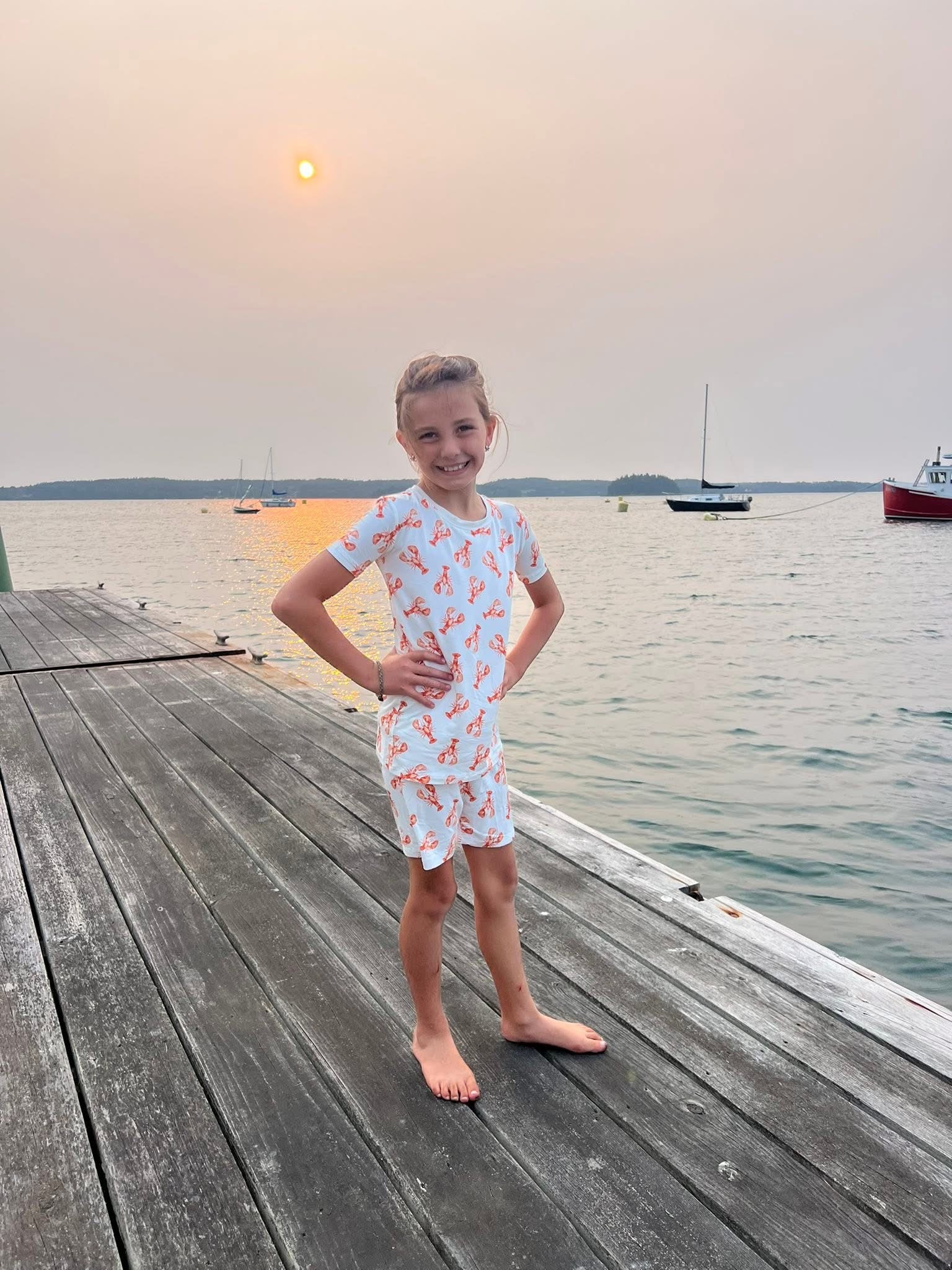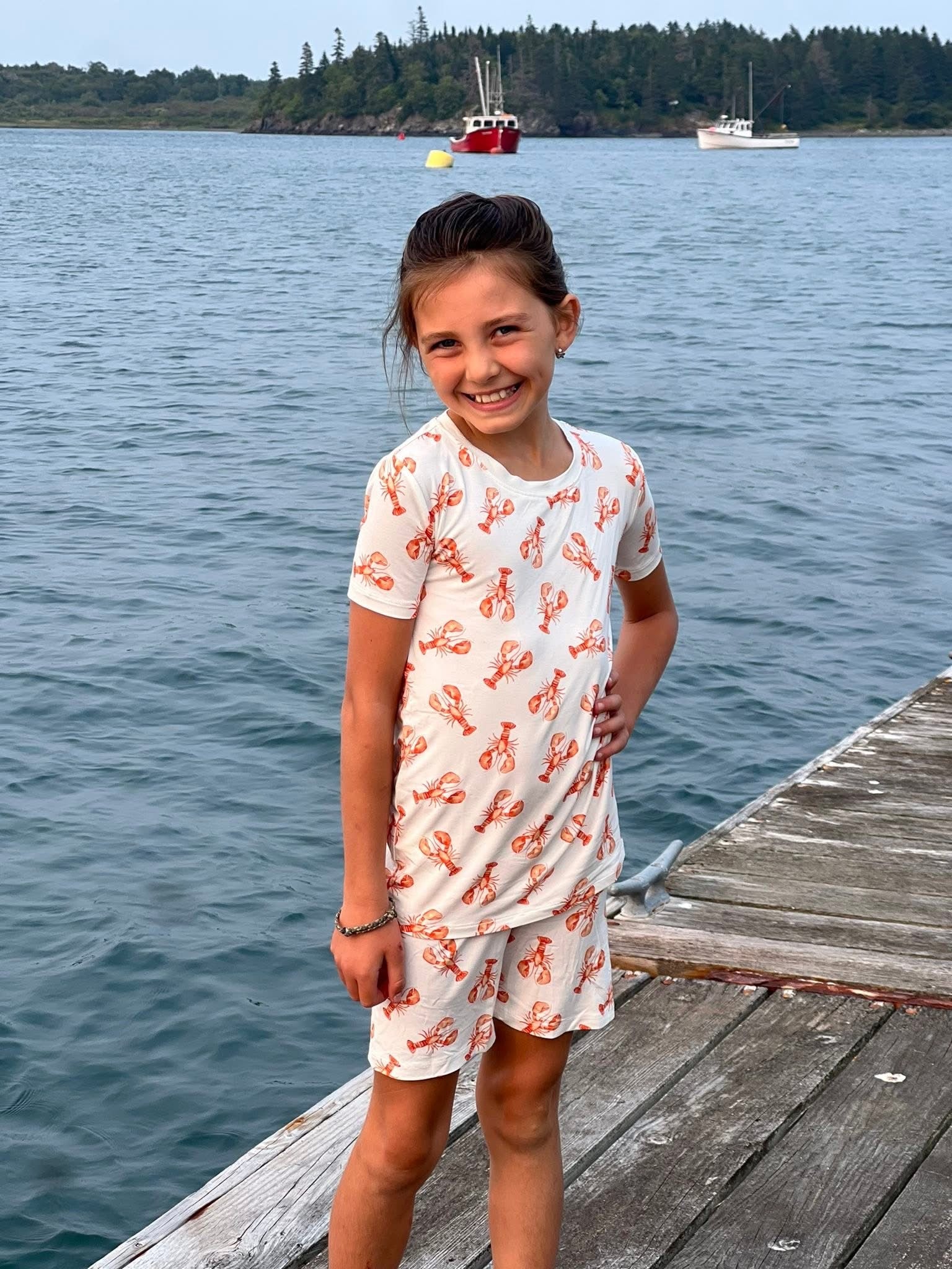 These Dale Short Sleeve Two Piece Pajama Sets feature a charming red lobster print inspired by the coastal Maine ocean. Made from soft, breathable bamboo fabric, they provide comfort and gentle temperature regulation for children aged 2T to 6T. The short sleeves and shorts design make them ideal for warmer nights, combining playful style with expert craftsmanship for a restful sleep experience.